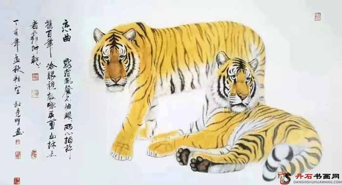 由于長期對虎的觀察和研究,他對虎的骨骼、肌肉、體態(tài),了如指掌,故其虎畫作品結(jié)構(gòu)嚴(yán)謹(jǐn),形神俱備,鮮活逼真,意態(tài)如生。他筆下的虎有行、伏、臥、蹲、躍、食、眠、嬉等多種姿態(tài),造型準(zhǔn)確,設(shè)色富麗。既表現(xiàn)虎嘯山林,懾人心魄的氣勢,又細(xì)致入微的表現(xiàn)灑脫自然的虎子溫情,無不傳神。其畫或取虎的兇猛彪悍,或取虎的嫵媚多姿,或取虎的伶俐乖巧,或怒吼,或嬉戲,或憩息,姿態(tài)各異。雄虎昂首長嘯,聲撼山谷;雌虎伏地養(yǎng)息,怡然自得;小虎則倚在雌虎背上挑逗嬉戲,稚態(tài)可掬。將虎威與虎愛融為一體,情趣盎然,美不勝收。