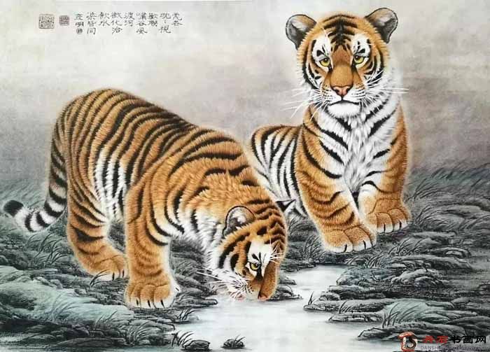 由于長(zhǎng)期對(duì)虎的觀察和研究,他對(duì)虎的骨骼、肌肉、體態(tài),了如指掌,故其虎畫作品結(jié)構(gòu)嚴(yán)謹(jǐn),形神俱備,鮮活逼真,意態(tài)如生。他筆下的虎有行、伏、臥、蹲、躍、食、眠、嬉等多種姿態(tài),造型準(zhǔn)確,設(shè)色富麗。既表現(xiàn)虎嘯山林,懾人心魄的氣勢(shì),又細(xì)致入微的表現(xiàn)灑脫自然的虎子溫情,無不傳神。其畫或取虎的兇猛彪悍,或取虎的嫵媚多姿,或取虎的伶俐乖巧,或怒吼,或嬉戲,或憩息,姿態(tài)各異。雄虎昂首長(zhǎng)嘯,聲撼山谷;雌虎伏地養(yǎng)息,怡然自得;小虎則倚在雌虎背上挑逗嬉戲,稚態(tài)可掬。將虎威與虎愛融為一體,情趣盎然,美不勝收。
